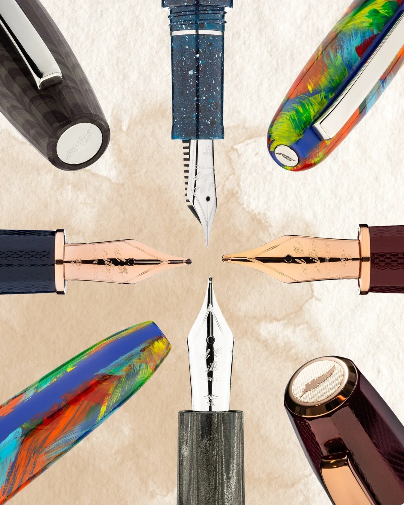 Eine Auswahl verschiedener Federschliffe: Kleinere Strichbreite, Oblique (LF/RF), Stub und Italic (cursive/crisp).